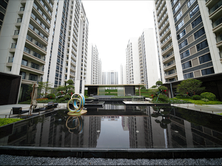 迎宾叠泉潺潺流淌,中央园林已成型,草坪铺得平整,灌木错落有致,不是效果图里的“纸上绿化”,而是走进社区踩进的绿意。