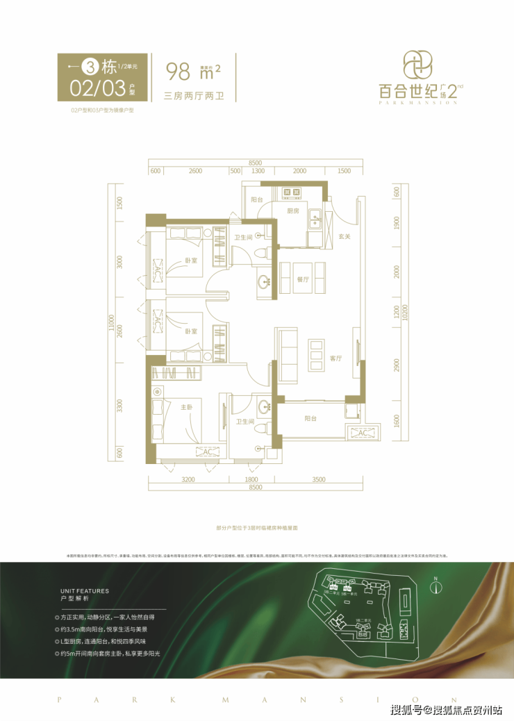 百合世纪广场二期(B-02地块),总占地面积约3.6万㎡,总建筑面积约27.03万㎡,计容建筑面积约19.38万㎡,共由3栋7个单元组成,总高是31-48层的住宅,其中1栋1单元住宅42F,1栋2单元住宅47F,2栋1单元住宅46F,2栋4/5单元住宅48F,3栋1/2单元住宅31F,另外2栋2单元公寓30F,2栋3单元商务办公楼22F,4栋是1所九班制幼儿园。