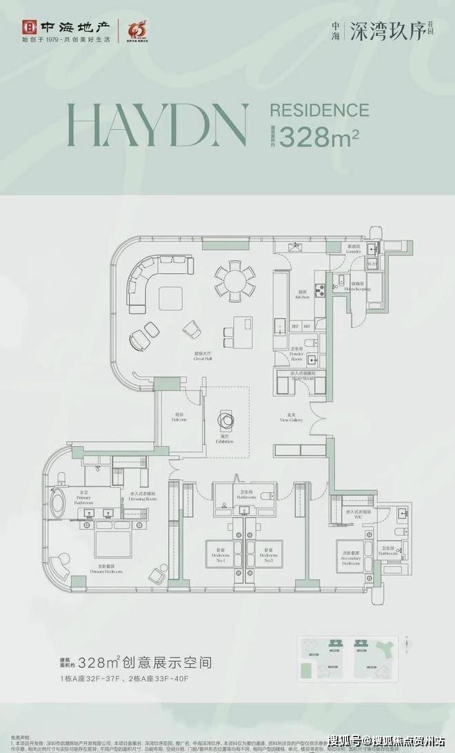 ①328平4+2房4卫,楼王户型,位于1栋A座01/02户,正南朝向,看小区园林景观。独立保姆套间,外立面采用270度玻璃幕墙,采光和通透好!