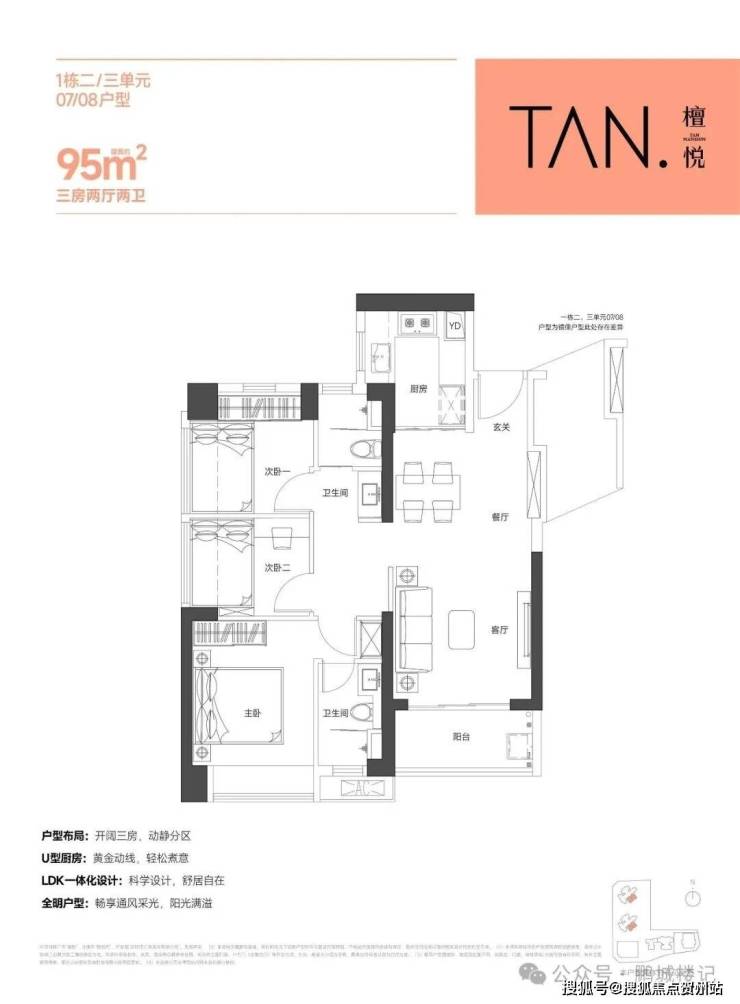 - 95㎡的3房2厅2卫,设计的是竖厅格局,进门入户玄关,客厅3.55米开间,LKDB一体化设计,有1个次卧做的双飘窗,U型厨房,卫生间三段式分离,全部东南朝向。