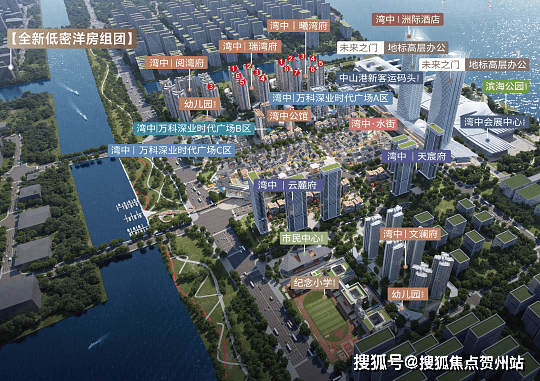 小区与图片:总建面约 155 万㎡大型滨海综合体,容积率 2.0(低密组团),绿化率 30% 以上。规划 16 栋住宅,配下沉式景观、环湾公园等,打造低密滨海宜居社区