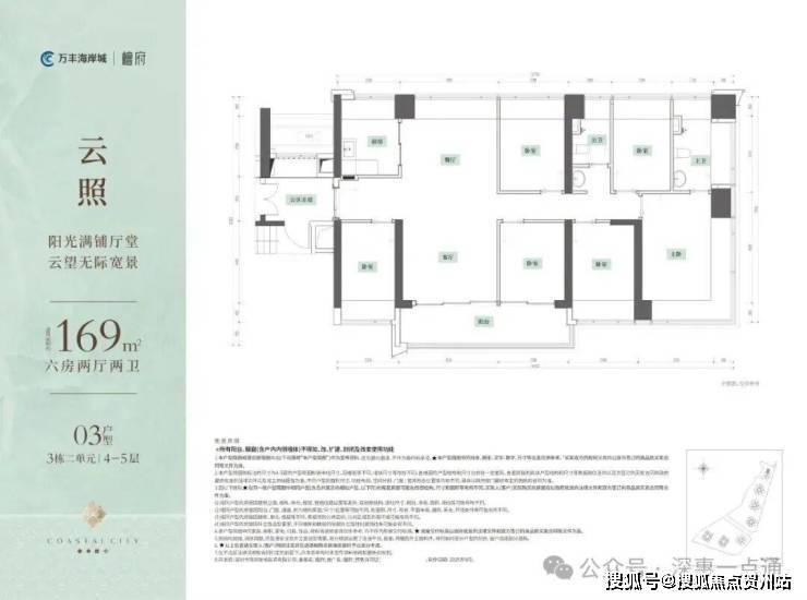 169㎡的6房2厅2卫,设计的是竖厅南北通透格局,独门独户,赠送私用公区走道,客厅4.15米开间,餐客厅分离设计,五开间朝南,主卧270°无柱转角飘窗,分别做到了主卧19.93㎡/次卧12.18m²/次卧11.45m²/次卧10.71㎡/次卧9.88m²/次卧9.86㎡(包含墙体飘窗),U型厨房,公卫三段式干湿分离,得房率约100%(包含赠送),7.05米长的超大观景阳台约12.33m²主朝东南向。赠送面积约31.69m²。