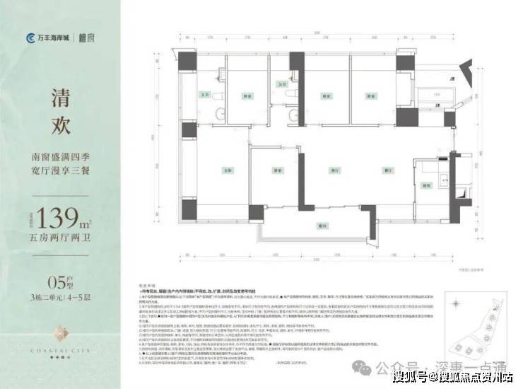 139㎡的5房2厅2卫,设计的是横厅南北通透格局,客餐厅6.25米开间,LDKB一体化,全屋12面飘窗,分别做到了主卧19.76㎡/次卧10.66m²/次卧10.47㎡/次卧9.98㎡/次卧9.28㎡(包含墙体飘窗),U型厨房,公卫三段式干湿分离,得房率约100%(包含赠送),客厅连接次卧出6.8米长的观景大阳台约11.9m²东南朝向。赠送面积约29.47m²。