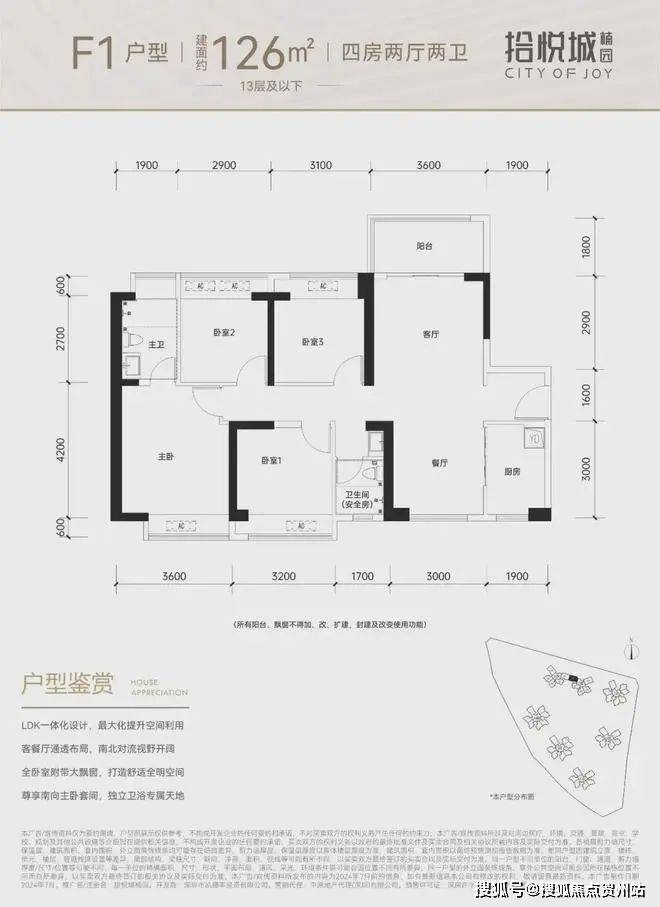 100平三房:设计的是竖厅格局,进门入户玄关,客厅3.4米开间,LDKB一体化设计,3个卧室分别做到了3米/2.9米/2.5米的宽度,U型厨房,公卫三段式分离,得房率:77.14%(不含赠送),阳台1.8米宽度,西南或东南朝向。