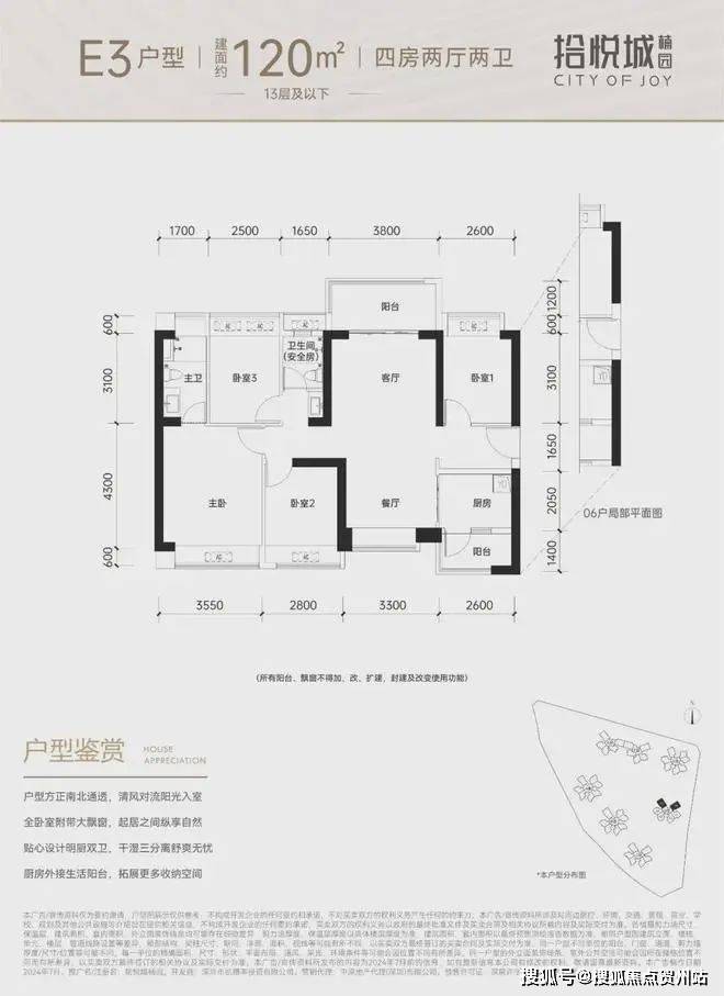 120平-140平,设计的是横厅南北通透格局,进门入户玄关,客餐厅6.3米开间,无过道设计,4个卧室分别做到了3.55米/3米/3米/2.8米的宽度,U型厨房,公卫三段式分离,得房率:74.31%(不含赠送),阳台1.8米宽度,主朝西南或东南向。