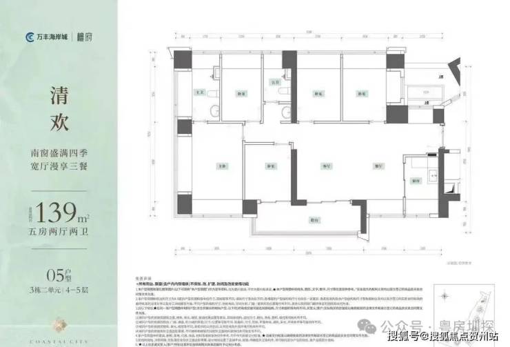 139㎡的5房2厅2卫,设计的是横厅南北通透格局,客餐厅6.25米开间,LDKB一体化,全屋12面飘窗,U型厨房,公卫三段式干湿分离,得房率约100%(包含赠送),客厅连接次卧出6.8米长的观景大阳台约11.9m²东南朝向。赠送面积约29.47m²。
