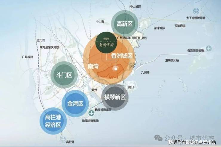 ▫南湾位居珠海地理几何中心,东面一桥之隔即为香洲老城区,南面与横琴粤澳深度合作区、十字门中央商务区一山之隔;西面规划鹤州新中心;