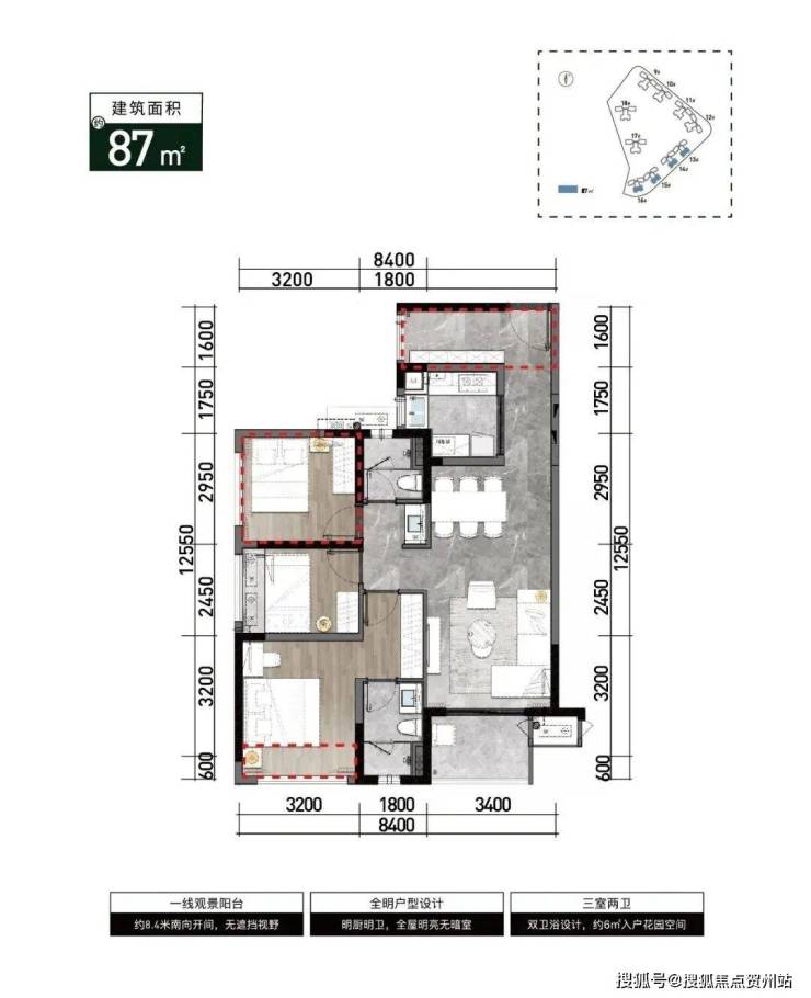 二期户型,01/02单位:87㎡三房两卫 朝南
