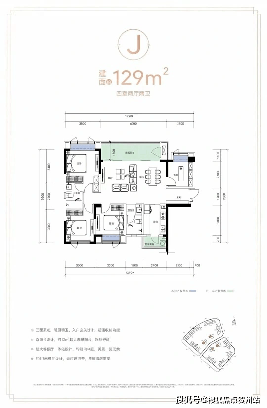 洋房:129-143㎡四房双套卧,四开间朝南,单价 20000-23000 元 /㎡,143㎡户型含 57㎡LDKG 一体化空间 + 6.6 米宽景阳台。