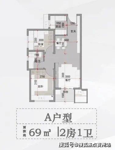 A户型 面积约69平方米 2房1卫
