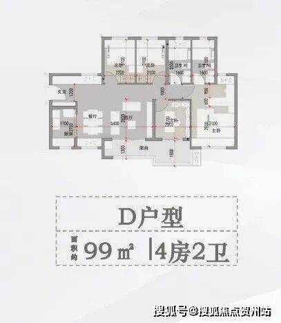 D户型 面积约99平方米 4房2卫