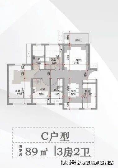 C户型 面积约89平方米 3房2卫