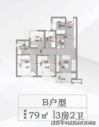 B户型 面积约79平方米 3房2卫