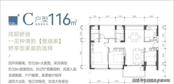 116㎡的4房2厅2卫,C户型,设计的是竖厅南北通透格局,餐客厅一体化设计,客厅3.8米开间,四开间朝南,4个卧室分别做到了主卧17.85㎡/次卧11.4㎡/次卧9.3㎡/次卧8㎡(包含墙体飘窗),都不用搭配飘窗做床,U型厨房,卫生间干湿分离,得房率约:93.13%(包含赠送),阳台主朝西南、东南或正南向。
