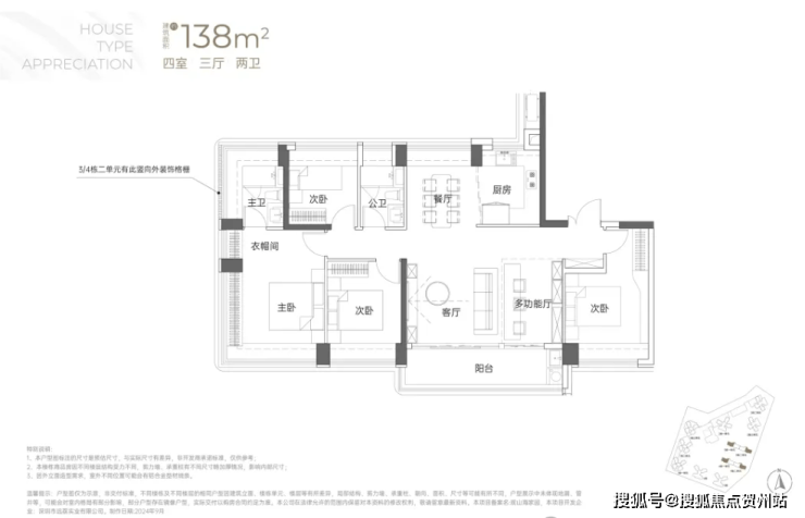 竖庭格局,西南向,基本居住功能与建面约108-110㎡4房2卫一致,但格局不一样,从目前公布的户型图上看,主要是主卧空间有了更大的提升,比如可以放更大一点的衣柜。但从位置上看,它所在的楼栋更靠近主干道,会有噪音影响。