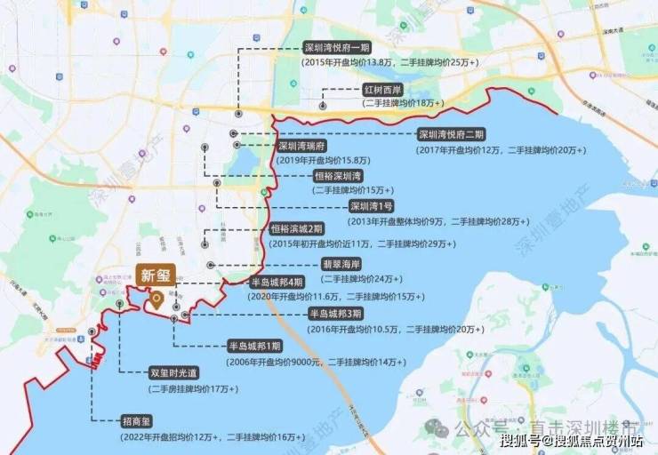 华侨城新玺项目位于蛇口街道南端,东南海玫瑰园三期,南面临深圳湾;与香港元朗隔海相望,连接香港的西部通道跨海大桥落脚于蛇口东角头。距离南山后海约4公里,与海上世界项目隔“小湾区”相望,