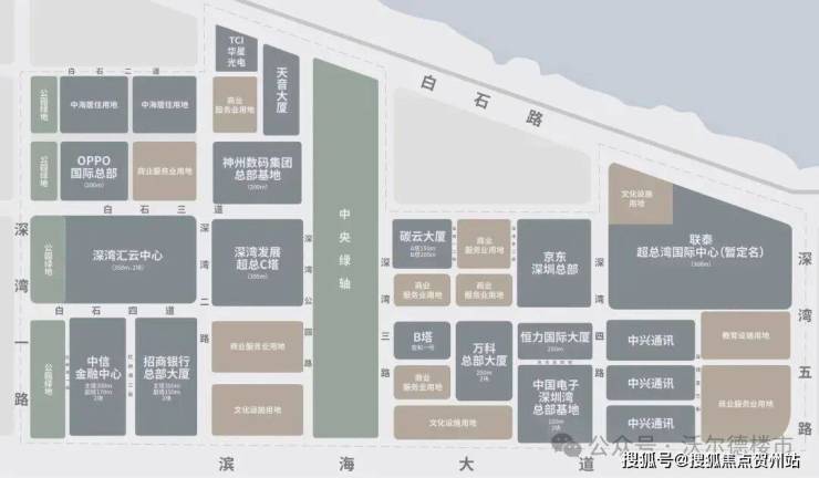 深超总片区现已开工项目16个,深湾汇云中心、神州数码集团总部、天音大厦、中国电子总部主体结构已封顶,中信金融中心、中兴通讯总部、OPPO国际总部、招商银行总部、碳云大厦等项目已进入主体施工阶段。世界500强企业总部争先进驻,是深圳未来最有发展潜力的区域,俨然深圳走向全球城市的名片。
