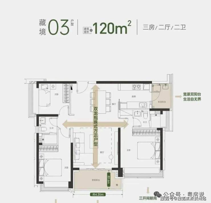 120平双龙抱珠3房2卫;三开间朝南,双阳台,无遮挡视野,总价990万起