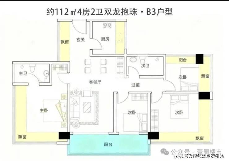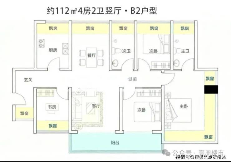 112㎡的4房2厅2卫(B3户型),设计的是竖厅双龙抱珠格局,进门独立入户玄关,餐客厅一体化设计,四开间朝南,全屋八面飘窗,主卧+1个次卧270°无柱转角飘窗,U型厨房,卫生间干湿分离,得房率约100%(包含赠送),客厅连接次卧出大阳台西南朝向。