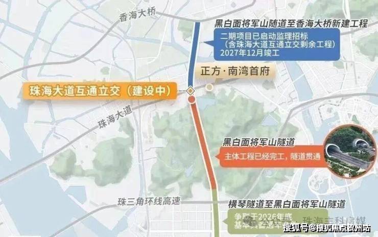未来周边小区业主即可在该区域完成调头,避免了绕行前行调头的问题,黑白面将军山隧道至香海大桥:2024年10月16日,官方公布了该段及珠海大道互通立交剩余工程的招标信息,计划2027年12月竣工