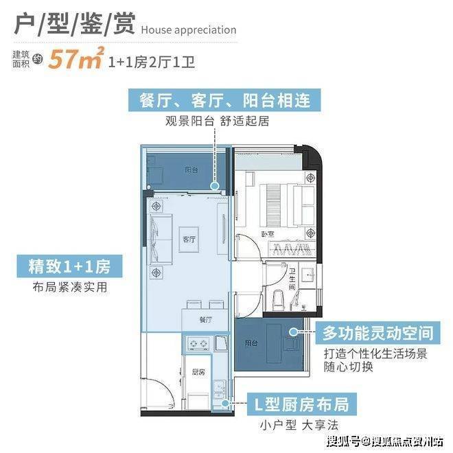 建面约57㎡的精致1+1房,餐厅、客厅和阳台相连的设计,增加了空间的通透感,减少了小户型的压抑感。
