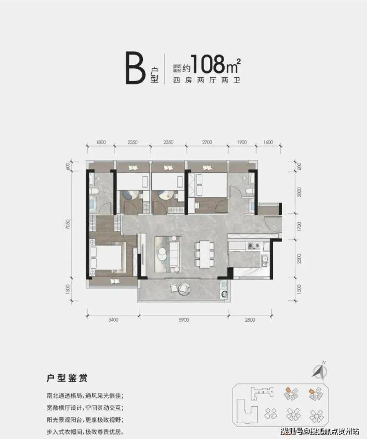 108㎡户型做的是横厅,动静分区,四房两厅一厨两卫一阳台的格局,这种户型最近几年非常常见了,优点就是横厅显得客厅更宽,有宽景阳台,室内通透性略好一些。