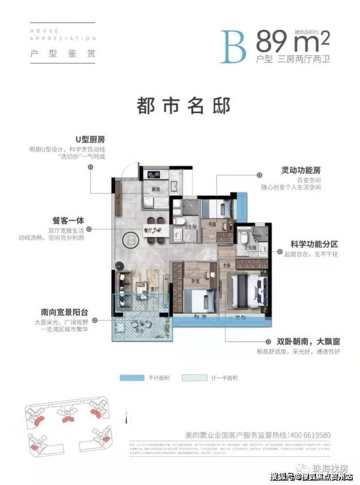 ■ 89㎡三房两厅两卫人性化设计,功能独立方便实用厅出阳台设计,享园林四季美景超高赠送面积,创意空间随心享