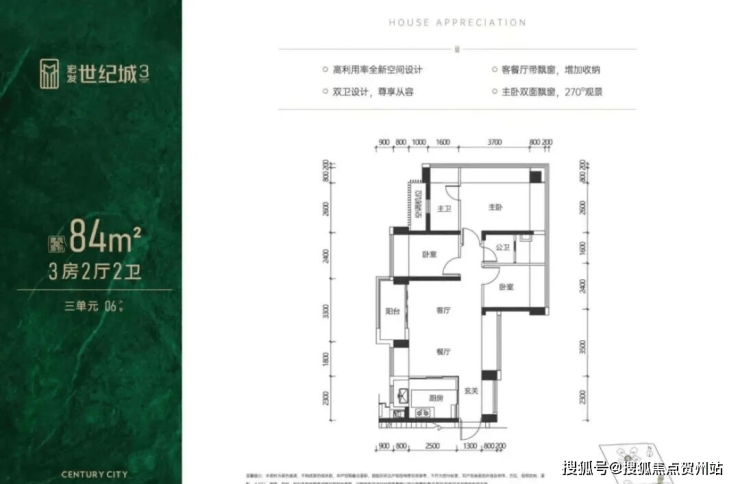 84㎡的3房2厅2卫,设计的是横厅南北通透格局,客餐厅5.1米开间,LDKB一体化设计,全屋10面飘窗,五开间朝南,主卧双面飘窗270°观景,3个卧室分别做到了主卧15.3㎡/次卧8.16㎡/次卧7.68㎡(包含墙体飘窗),U型厨房,卫生间干湿分离,阳台5.61㎡主朝西南向(差不多正西)。得房率约103.32㎡(包含赠送),赠送面积有22.8㎡。