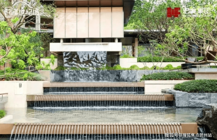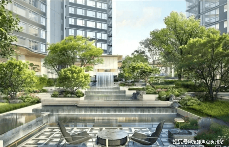 【飞瀑氧吧】:园林中庭巧妙利用高差,跌瀑、叠水、山石、树木等自然元素与中庭水苑、茶室等现代空间相互交织,营造典雅森系水院空间;