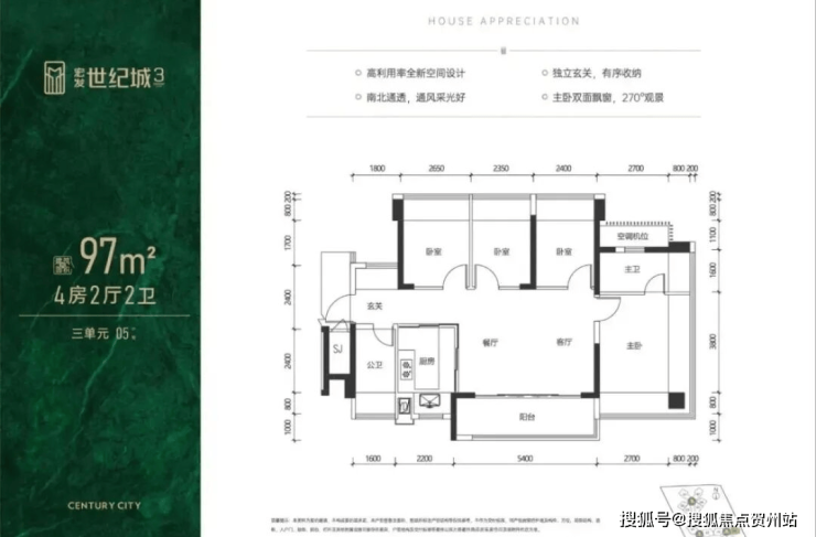 97㎡的4房2厅2卫,设计的是横厅南北通透格局,客餐厅5.4米开间,LDKB一体化设计,全屋9面飘窗,五开间朝南,主卧双面飘窗270°观景,4个卧室分别做到了主卧16.1㎡/次卧8.75㎡/次卧7.92㎡/次卧7.76㎡(包含墙体飘窗),U型厨房,卫生间干湿分离,阳台9.72㎡主朝正南向。得房率约97.35㎡(包含赠送),赠送面积有21.9㎡。