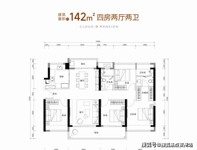 142㎡的4房2厅2卫,(D户型,1栋2单元05户型)设计的是竖厅南北通透格局,客厅4米开间,四开间朝南,双阳台设计,4个卧室分别做到了3.6米/3.3米/3米/2.8米的宽度,主卧大套房设计,客厅连接次卧出7.3米长的大阳台,U型厨房,得房率75-77%(不含赠送),大阳台主朝东南朝向。