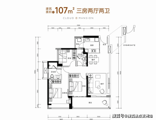 107㎡的3房2厅2卫(B2户型,1栋4单元03/04户型)设计的是经典竖厅格局,进门独立玄关,客厅3.5米开间,LDKB一体化设计,动静分区,3个卧室分别做到了3.15米/2.85米/2.65米的宽度,客厅连接次卧出6.35米长的大阳台,二字型厨房还带1个小生活阳台,得房率75-77%(不含赠送),阳台有朝西向、朝东向或朝南向。