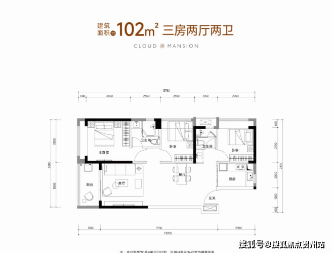 102㎡的3房2厅2卫(A2户型,1栋4单元01.06户型),设计的是竖厅格局,进门独立玄关,客厅3.5米开间,LDKB一体化设计,3个卧室分别做到了3.35米/2.95米/2.65米的宽度,L型厨房,公卫三段式分离,得房率75-77%(不含赠送),阳台朝西向或东向。
