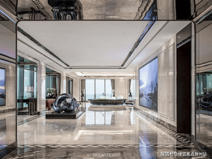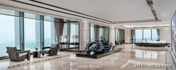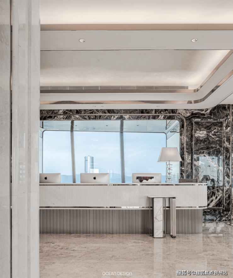 当迈入接待大厅,场所氛围与339米高空共同营造出如有白云作伴之感,微风泛起江面涟漪,设计侧重突显位置独特的视觉焦点,以简约先行为概念,脱离形式材质的繁冗,平行都市与人居生活方式,勾勒湾区城市封面。