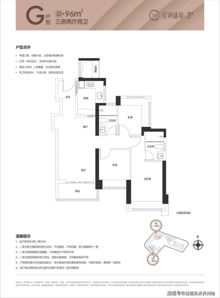 94-96㎡的3房2厅2卫(1栋2单元03/04户型),设计的是经典竖厅格局,创新LDK一体化餐客厅,S墙设计预留冰箱位,三开间朝南,次卧270度环幕设计,U型厨房,卫生间干湿分离,得房率76%(不含赠送),全部东南朝向。