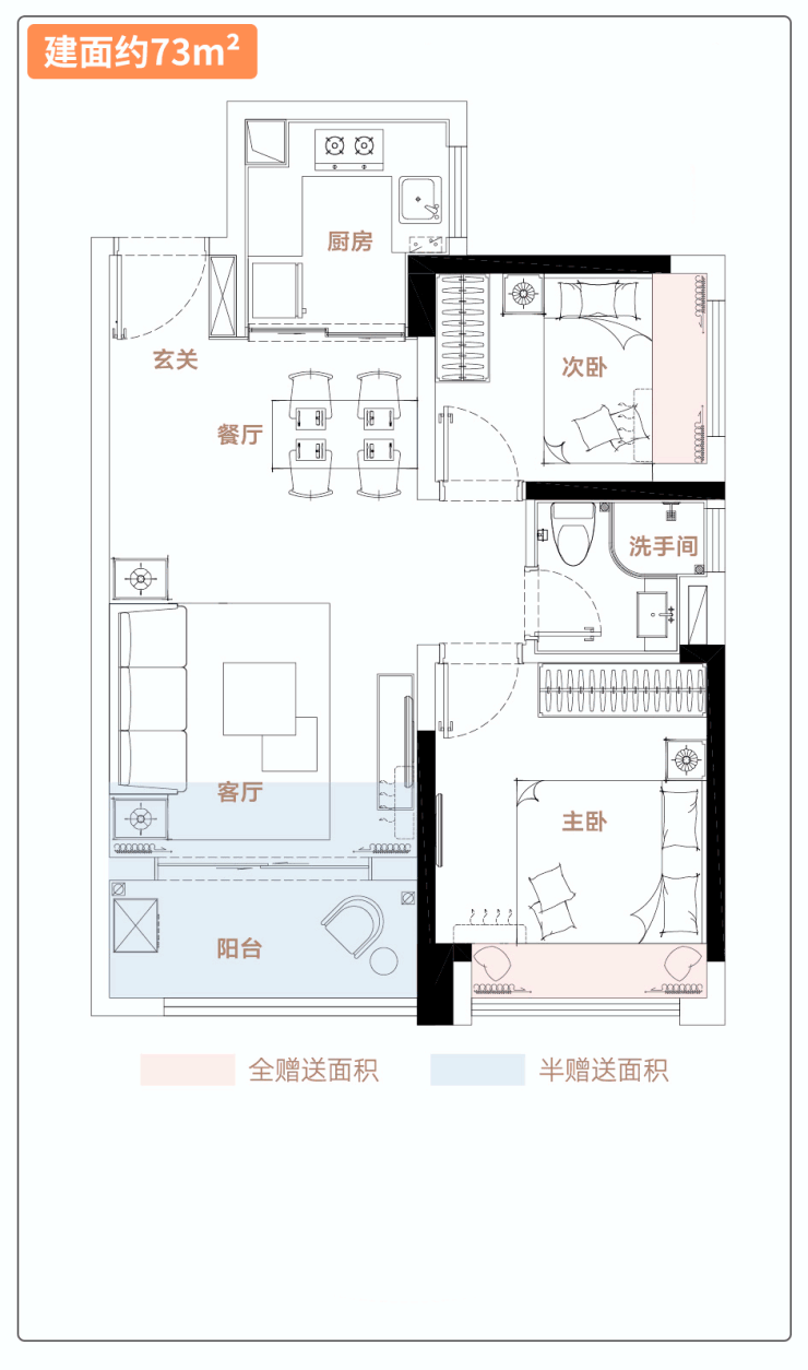 更赞的是,飘窗不计面积、客厅阳台只计一半面积!超高的赠送面积,毫不夸张的说,小面积住出大面积的舒适感,在此就能实现。