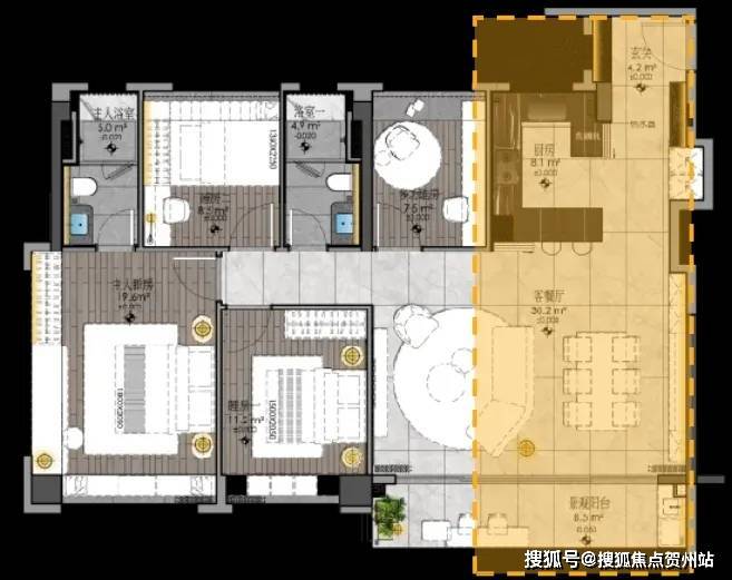 将L-living room(客厅)、D-dinning room(餐厅)、K-kitchen(厨房)和G-garden bal- cony(花园阳台)四个公共区域融为一体,生活动线更合理,空间感更强,尽显通透;