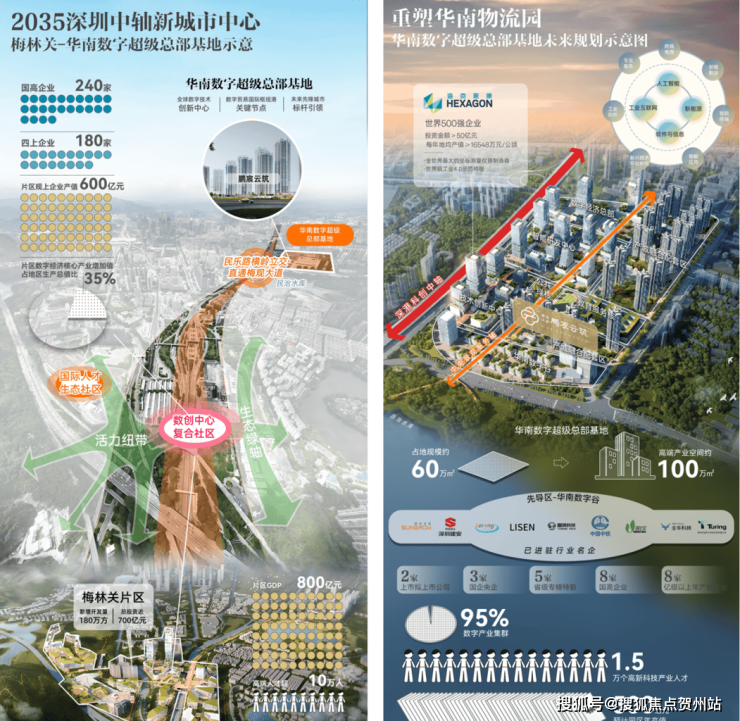 对标深超总、腾讯企鹅岛及香蜜湖国际金融中心,四大微城市之一,产学研商住定位,世界500强海克斯康已落户,已集聚35+龙头名企,打造湾区数智产业集群,数字产业集群度达95%,驱动板块加速蜕变。