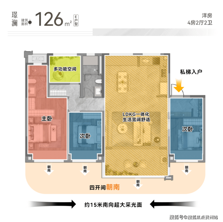 首先来看建面约126㎡四房两厅两卫的洋房户型,其专梯入户的设计,赋予您专属的归家仪式感。
