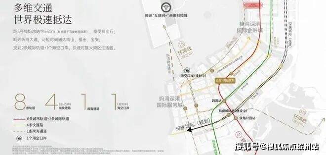 周边共规划6条地铁线、2条城际轨道、1条妈湾跨海隧道及1个海空口岸。距5号线妈湾站约550m,听海大道贯穿前海,可短时间通达南山、福田、宝安,快速链接大湾区生活圈