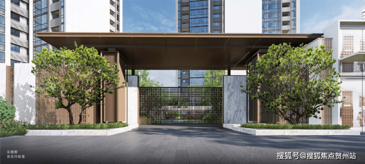 🔘威仪门庭:以东方雅韵为出发点,从尺度、比例、制式、材质等细节方面,将新中式建筑精髓与当代格调完美融汇于车库、大堂、社区大门之中,极致挑高尺度,尽显恢弘气度