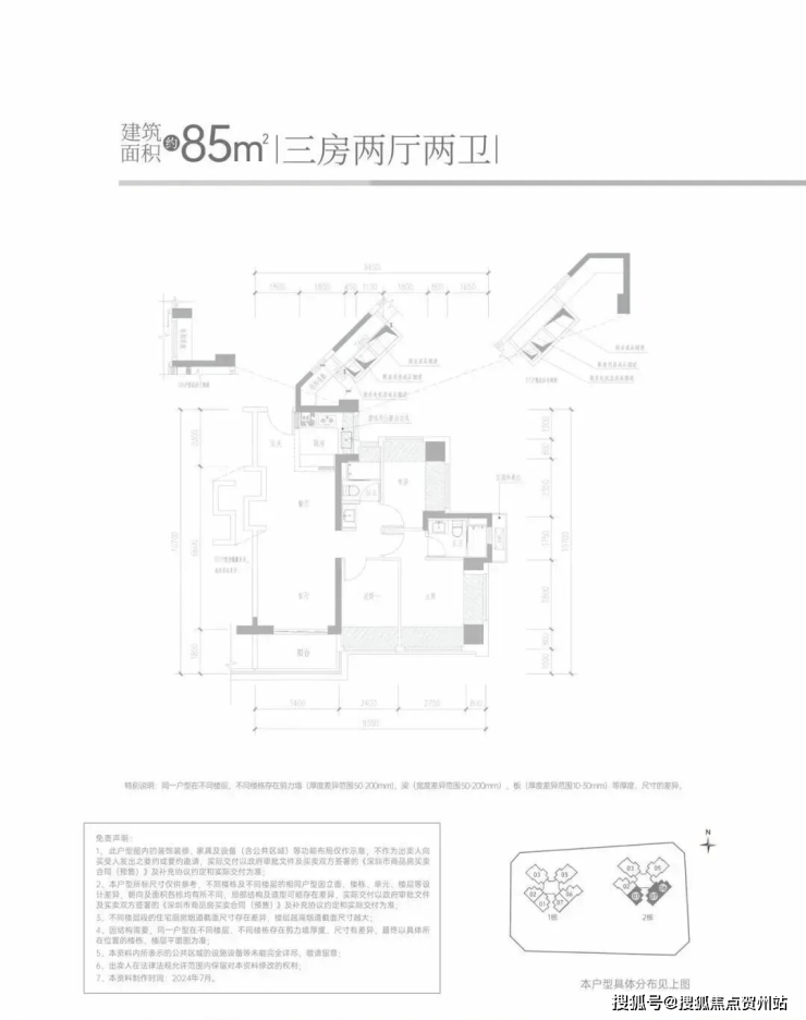 85㎡的3房2厅2卫,设计的经典竖厅格局,客厅3.4米开间,LDKB一体化设计,S墙设计预留冰箱卡槽位,3个卧室分别做到了3.55米/2.6米/2.4米的宽度,U型厨房,公卫三段式分离设计,得房率:79.6%(不含赠送),阳台进深1.8米,有西南或东南朝向。