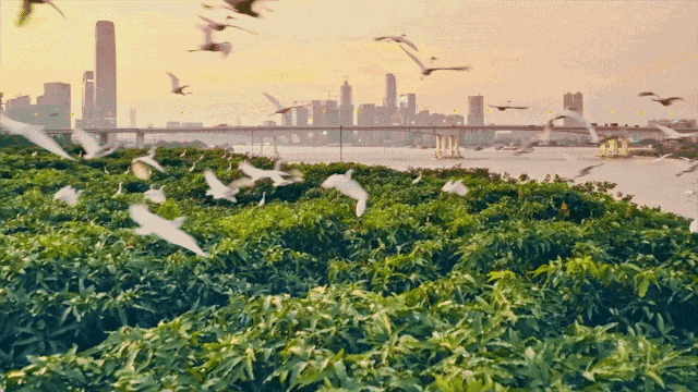 原生湿地林区里,聚满鹭鸟,“落霞与孤鹜齐飞”的画境,定格在城市夕阳下;