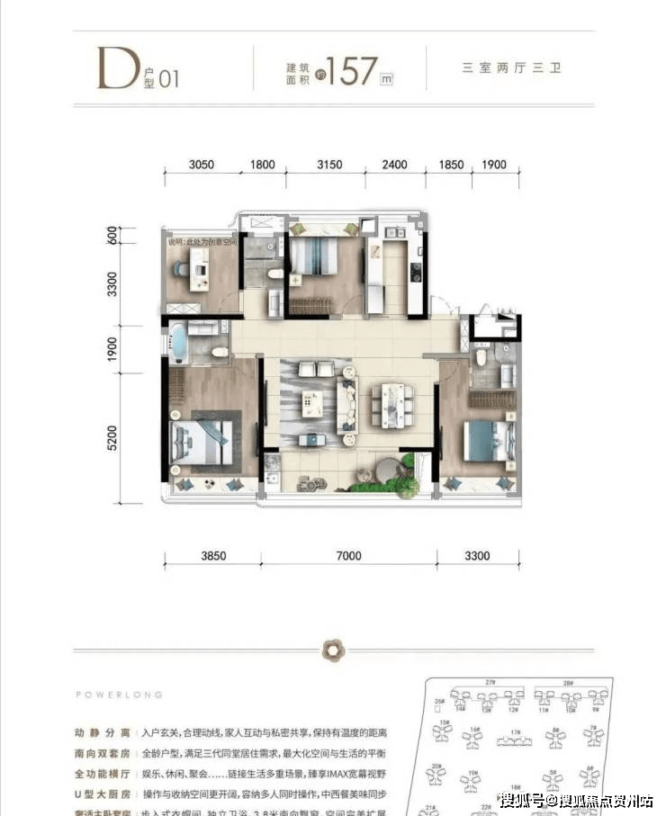 157㎡大户型:针对高端改善客户,空间布局更为阔绰,充分考虑多代同堂家庭的居住需求,实现家庭成员间的互不干扰与和谐共处。