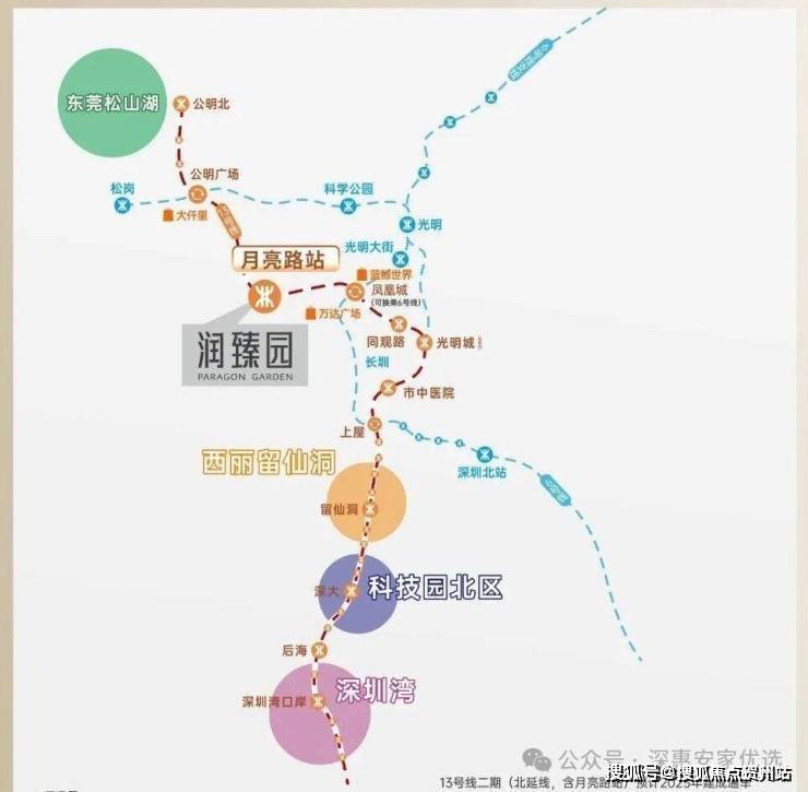地铁13号线:纵贯光明、宝安、南山三区的深圳南北大动脉”。全期建成后,南接香港、北连东莞,串联光明科学城、南山、科技园、东莞松山湖、深圳湾总部基地等科创总部集群;(*规划中,该规划属于片区更新单元范围内。)