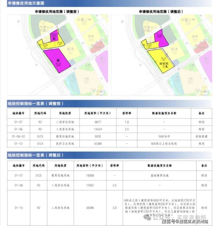 01-13地块用地面积由42366平方米调整为38396平方米,用地性质由医疗卫生用地(GIC4)调整为二类居住用地(R2),容积率由“-”调整为“3.9”,配套项目名称由“800床以上综合医院”调整为“9班幼儿园(占地面积2700平方米,建筑面积4500平方米),托育机构(建筑面积500平方米)、社区级公共配套用房(建筑面积1500平方米)、社区体育活动场地(场地面积1250平方米)、社区儿童游戏场地(场地面积1200平方米)”,备注“规划”其中1-13也是现在即将土拍的A815-0036地块