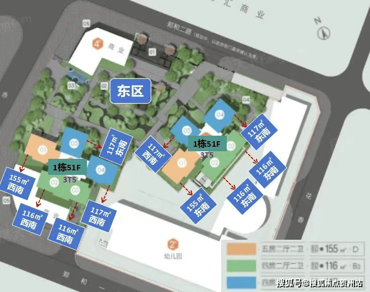 目前加推东区,整个小区有4栋建筑,1/3栋是商品房建筑,2栋是幼儿园、4栋是商业;东区占地1.35万㎡,480套116-155平米4房,均是3T5户,总层高51层,楼是架空层,16/34为避难层。
