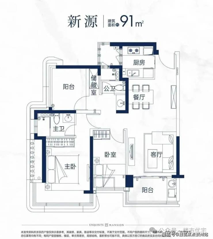 91㎡的3房2厅2卫,设计的是经典竖厅格局,进门入户玄关,客厅3.3米开间,LDKB一体化设计,动静分区,三开间朝南,主卧转角飘窗带1个设备平台,U型厨房,公卫三段式干湿分离,还带1个设备平台,得房率约89%(包含赠送),正南朝向。