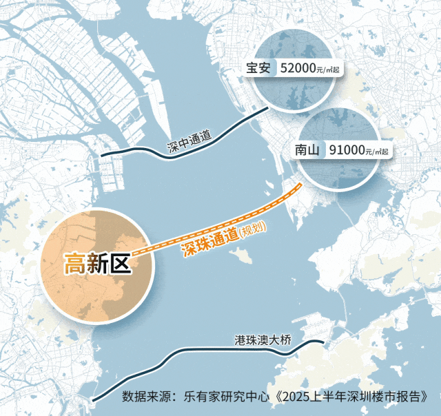 深珠通道另一端的 深圳南山,作为全国科创与金融高地,房价早已站上 9万/㎡的高位(来源:乐有家研究中心),高昂的置业成本让不少年轻高精尖人才望而却步。