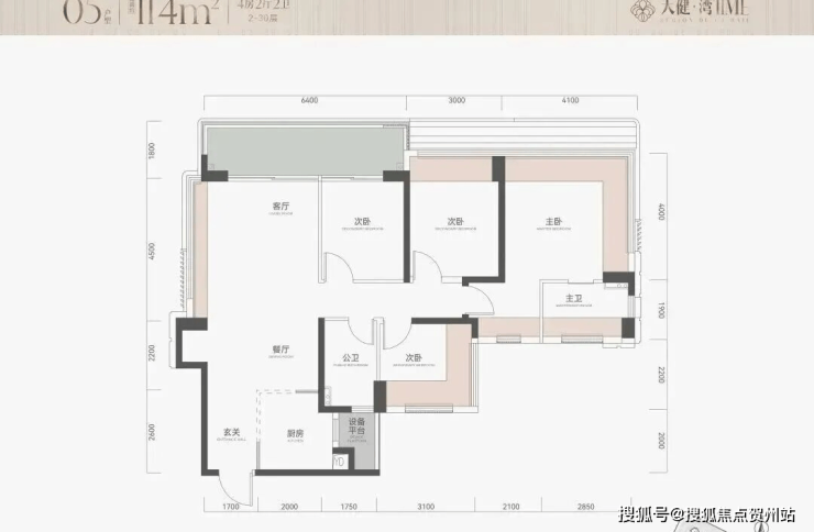 114㎡4房2卫,竖厅户型,朝北对着金众,户型结构和113完全一样,就是客厅也做了一面4.5米宽的凸窗;